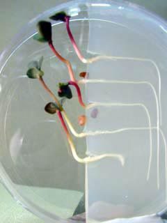 Sur cette image issue de travaux pratiques sur le gravitropisme, on peut voir des plantules d’Arabidopsis dont les boîtes ont été inclinées à 90°C après leur germination. Les racines subissent un gravitropisme positif (elles vont vers le sol), les tiges un gravitropisme négatif (elles s’éloignent du sol).