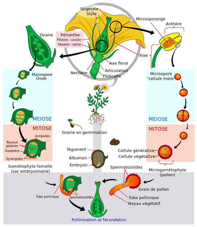 Qu’est ce qui différencie donc les plantes « à fleurs » des plantes « sans fleurs » ? La réponse est simple : le sexe ! A partir de cette fameuse lignée des « plantes à fleurs », que l’on appelle les « Angiospermes » ou « Magnoliophytes » dans les classifications plus récentes, les organes sexuels de la plante sont contenus dans des fleurs, les ovules femelle sont protégés par un ovaire et l’embryon de plante, après fécondation, sera quant à lui bien protégé dans une graine contenant un tissu nourricier.