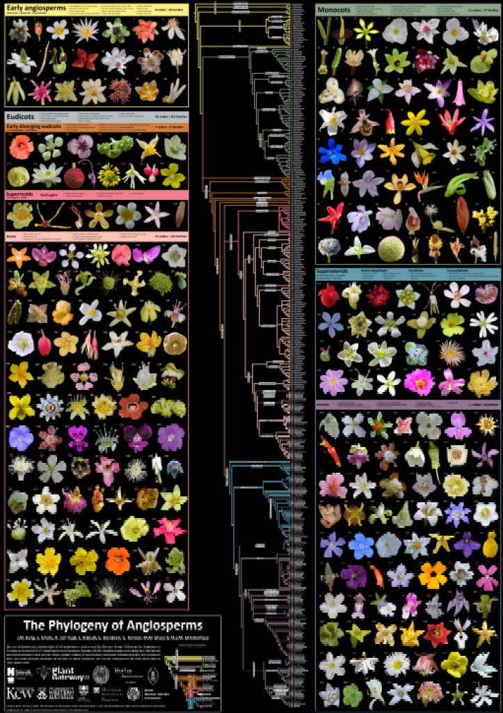 Dans ce poster téléchargeable gratuitement sont représentés les exemples de fleurs des plus grandes familles d’Angiospermes, ainsi que leur lien de parenté.