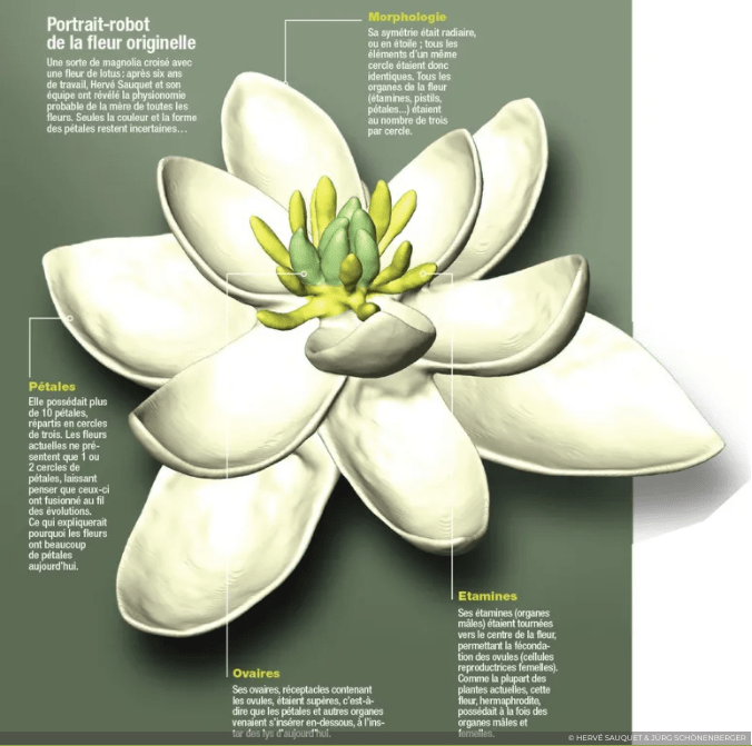 A propos de la première fleur, je vous recommande l’excellente vidéo de Sciences de Comptoir (abonnez-vous), ainsi que l’interview de Jörg Schönenberger qui a participé à ces travaux.