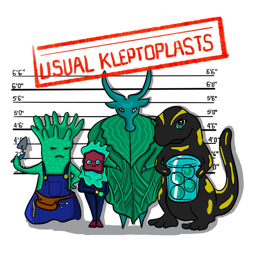Pour certains, ce pacte est transgressé pour littéralement devenir… du vol ! C’est là qu’on parle de kleptoplastie réelle. Un kleptoplaste, c’est un kleptomane qui ne peut pas s’empêcher de voler, avec une spécialité pour les plastes. (12)