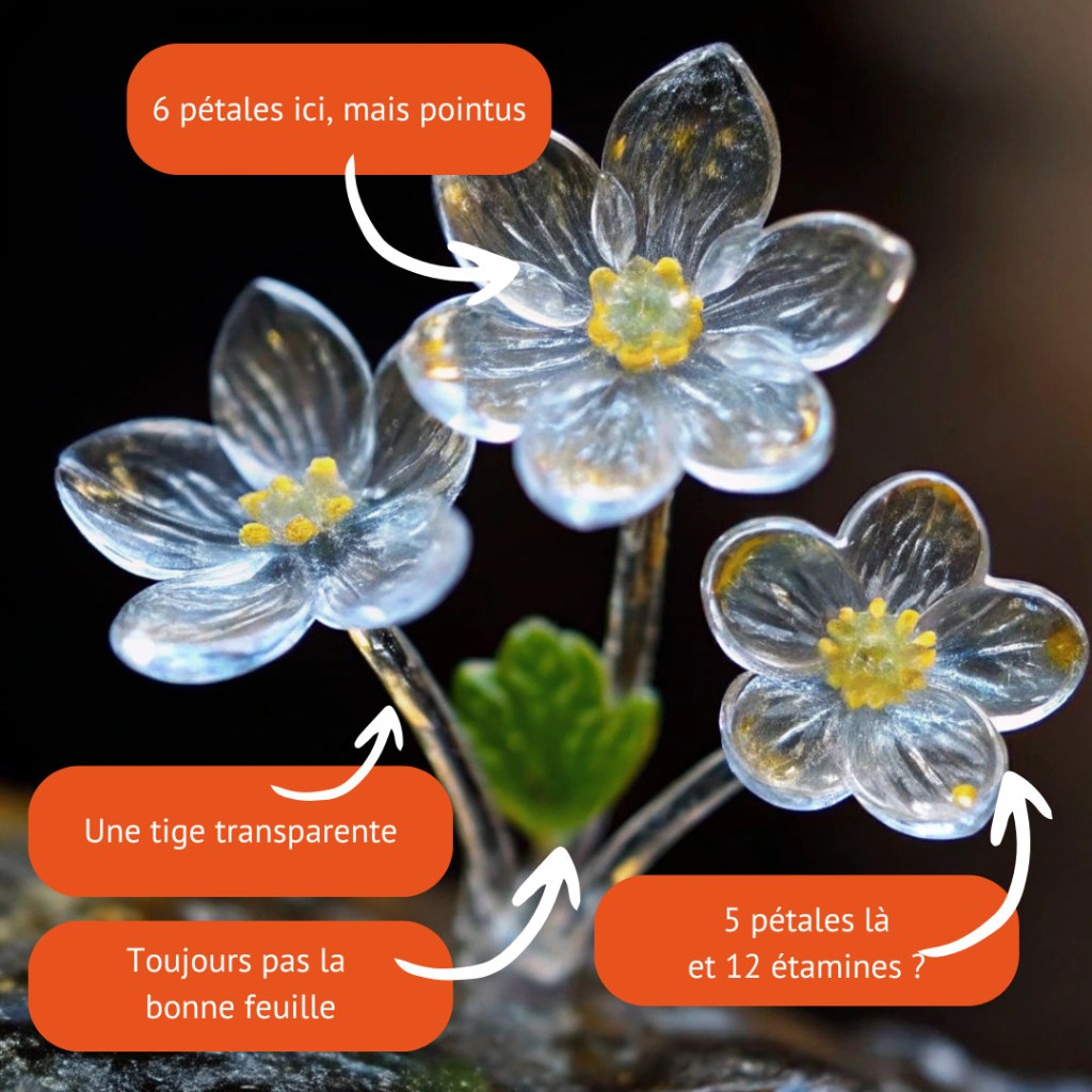 Cette image a déferlé sur nos réseaux sociaux ces derniers mois comme une trainée de poudre… Il s’agirait d’une photo de Diphylleia grayi, la « fleur squelette ». Une plante venue d’Asie, dont les pétales deviennent totalement transparents sous l’effet de l’humidité. Une simple recherche sur internet nous renseigne sur le fait que le nom de la plante et ses propriétés existent bel et bien. La photo en revanche… est totalement fausse ! Elle a été produite par une intelligence artificielle générative, ces nouveaux outils permettant de produire des images sur la base de quelques lignes de texte. Truffées d’erreurs anatomiques et de bizarreries, ces fausses images d’illustration de la biodiversité posent de nombreuses questions éthiques et pédagogiques.