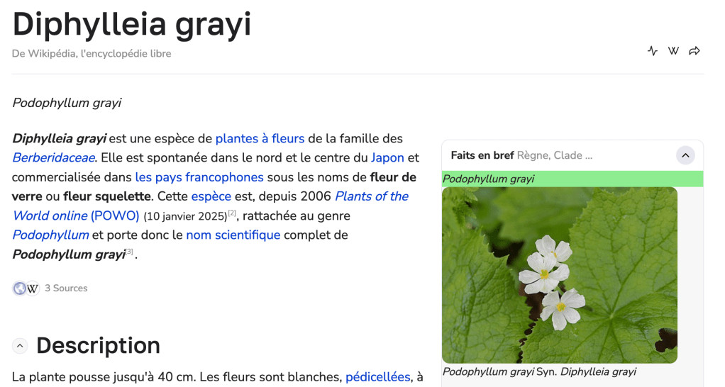 Je trouve effectivement que le nom « Diphylleia grayi » est un synonyme de « Podophyllum grayi« , qui est le nom scientifique accepté de notre plante de nos jours. Les botanistes refont régulièrement la classification, et parfois les plantes changent de boîtes. Cette plante est désormais dans le genre « Podophyllum », comme me le disait l’article Wikipédia. (L’espèce acceptée est surlignée en bleu lorsqu’on fait la recherche).