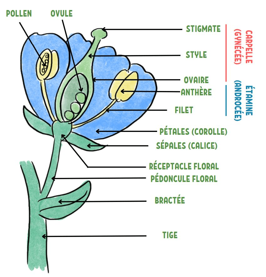 Je vous remet un schéma de fleur si vous êtes perdus dans le vocabulaire, que vous pouvez également retrouver ici, dans cet article du Plantoscope.